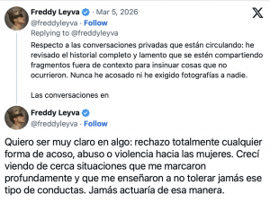 “Respecto a las conversaciones privadas que están circulando: he revisado el historial completo y lamento que se estén compartiendo fragmentos fuera de contexto para insinuar cosas que no ocurrieron. Nunca he acosado ni he exigido fotografías a nadie”, declaró en X.